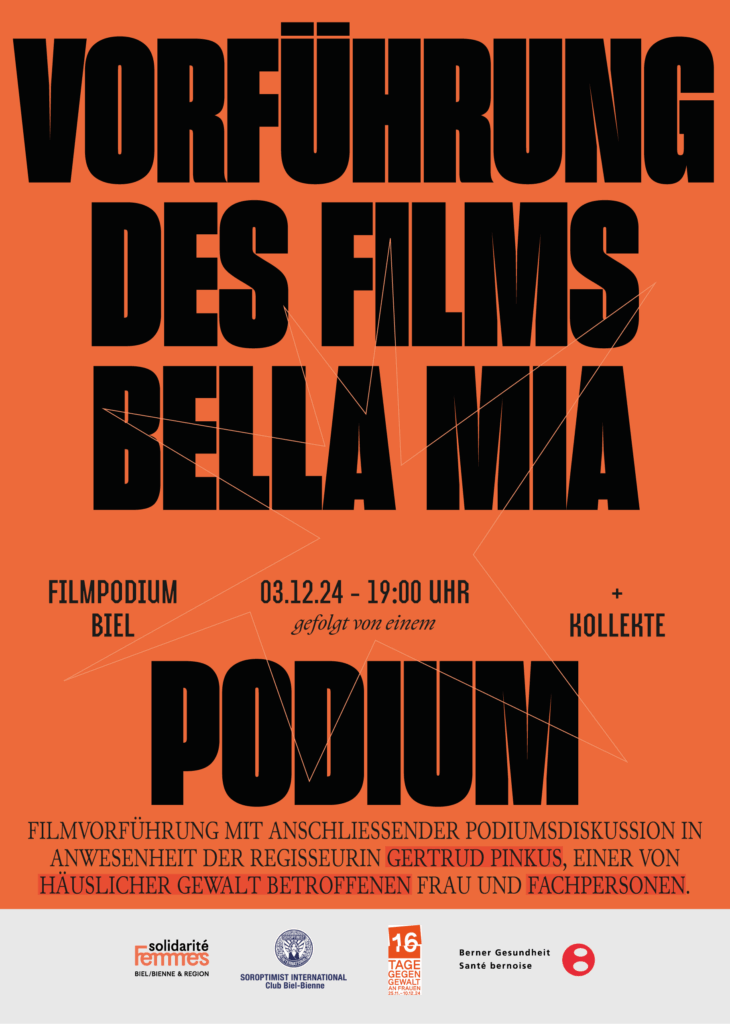 Solidarité femmes, BEGES Biel und Soroptimist Biel präsentieren mit Unterstützung der Stadt Biel das poetische Filmessay «BELLA MIA» (ca. 30 min.) und ein Podium mit der Regisseurin Gertrud Pinkus, zwei ehemaligen Betroffenen von Häuslicher Gewalt, einer Psychiaterin, je einer Mitarbeiterin der BEGES sowie von Solidarité femmes. Es wird über den Film und mögliche Wege aus der Gewalt, Motto der diesjährigen Aktionstage, diskutiert.